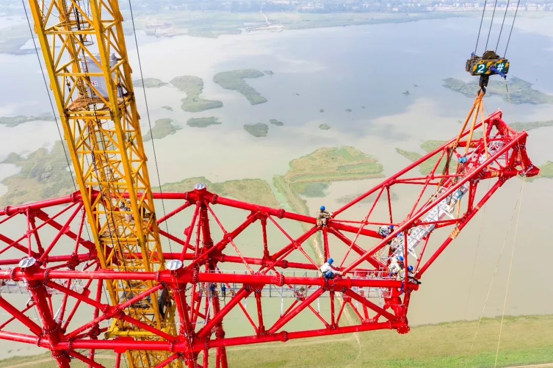 工程建設(shè)中最令人矚目的是跨越塔成功封頂,施工人員要在270多米高空中安裝500千伏淮河大跨越工程北岸跨越塔橫擔(dān),跨檔距1918米,單座跨越鋼管塔重達(dá)1308噸、全高274.9米,需要大型起吊設(shè)備加上吊裝帶將其緩緩吊裝至指定位置,配合人力進(jìn)行安裝。